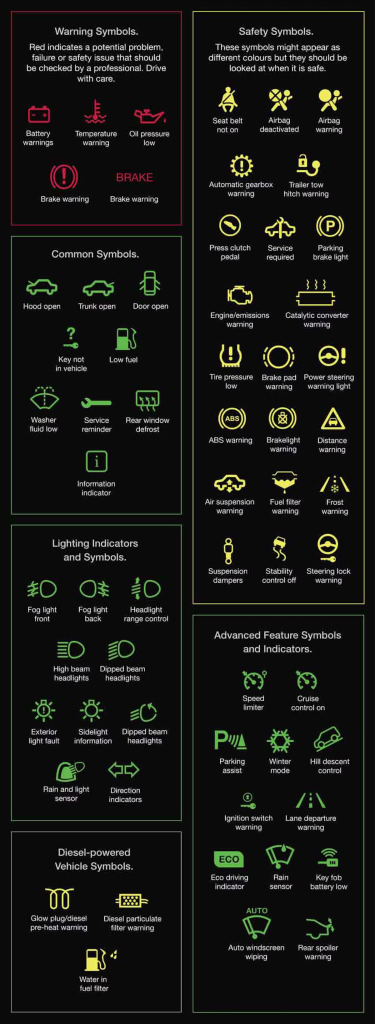 Oil Pressure Warning: Indicates a loss of oil pressure. Check the oil level immediately and top up if needed. If the light stays on, stop driving to avoid engine damage and have it towed for repairs.