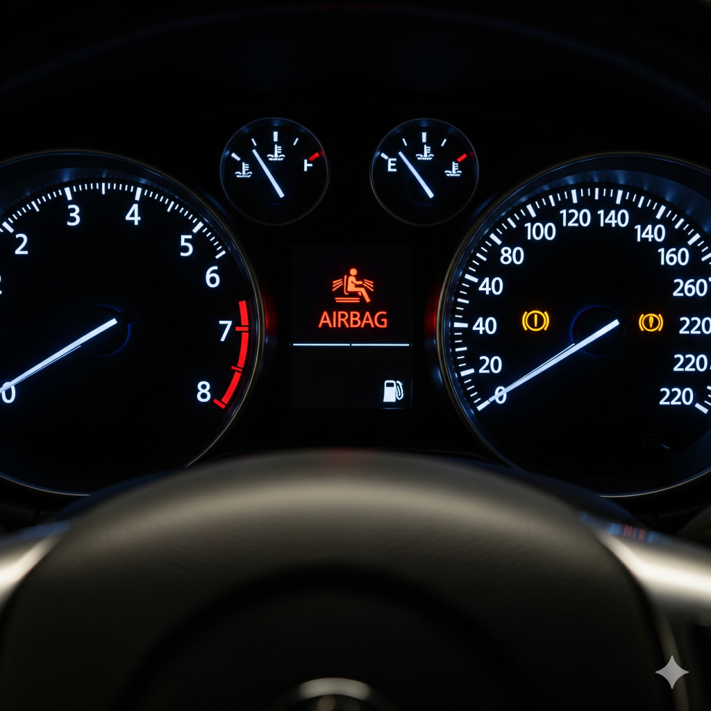 The airbag warning light (sometimes shown as an SRS or Supplemental Restraint System light) indicates that there’s a fault in your vehicle’s airbag system. When this light stays on, it means one or more airbags may not deploy in an accident. An assessment diagnoses the fault and confirms the repairs needed to restore full safety function.
